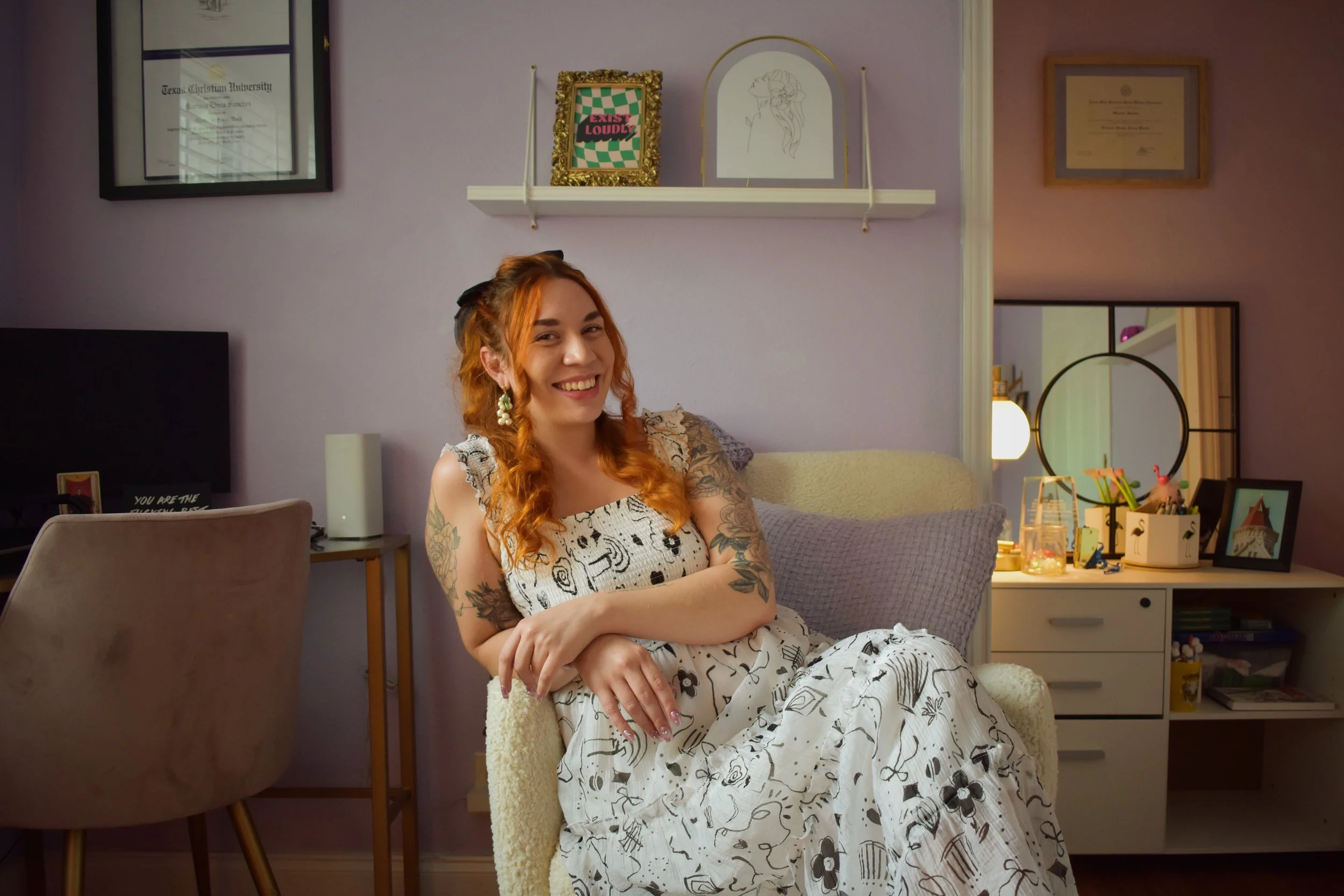 Outside the therapy room, I am an artist, I spend a lot of my time writing poetry, dancing, and creating art in all forms! I also enjoy getting out in nature and spending time with my partner and our daughter, as well as close friends! You can also find me meditating and intention-setting, while taking long walks in nature that help me feel re-centered. -